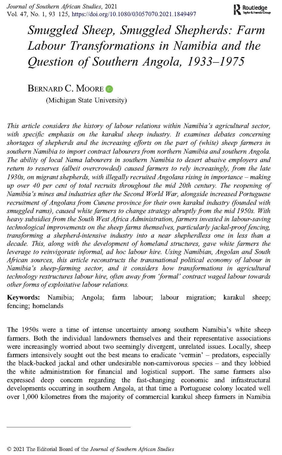 This article explores how the karakul sheep farming sector changed over the mid-twentieth century in response to labour recruitment crises, ecological constraints, and global market demands. It reveals how this obscure kind of sheep farming conditioned rural Namibia for decades to come.